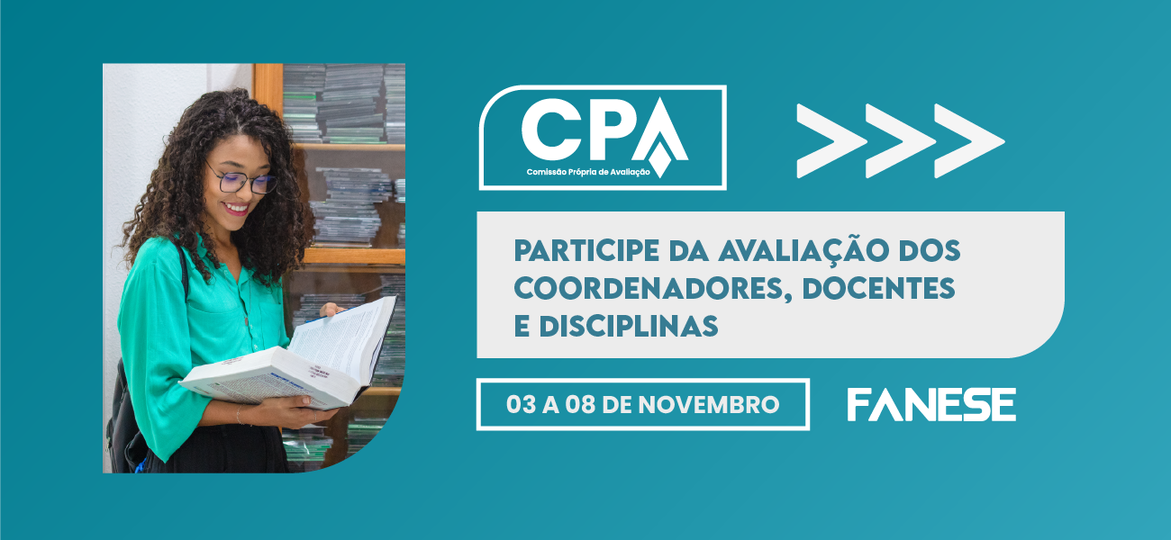 A Comissão Própria de Avaliação (CPA) da Fanese realizará a Pesquisa de Avaliação dos Coordenadores, Docentes e Disciplinas, entre os dias 03 e 08 de novembro. A iniciativa tem como objetivo ouvir os estudantes e reunir percepções que contribuam para o aprimoramento contínuo da qualidade acadêmica.